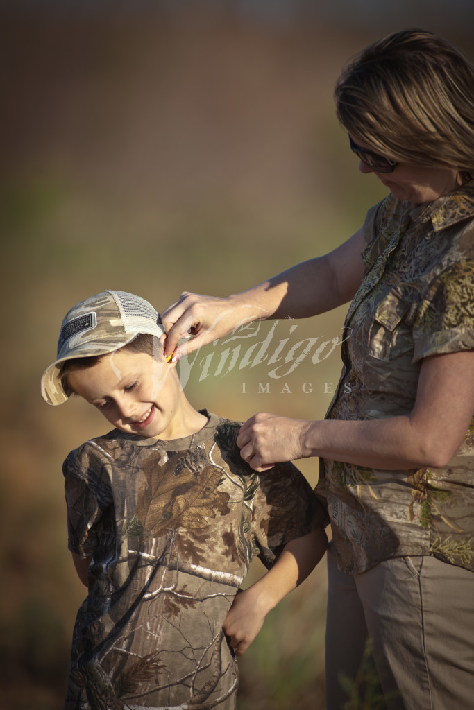 MOTHER PUTTING EARLPUGS IN THE EARS OF A YOUNG DOVE HUNTER REALTREE CAMOUFLAGE RUSSELL GRAVES – WINDIGOIMAGES.COM